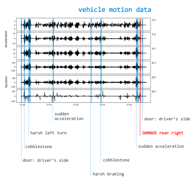 Imagine a vehicle driving over a speed bump — and then later scratching a parking post. Both result in anomalies in the acceleration data, where the speed bump generates significantly higher spikes and disturbances than the actual damage event, but carvaloo’s Motion AI can tell them apart. That’s because the AI doesn’t just look at the impact magnitude; it analyzes and understands the full context:
